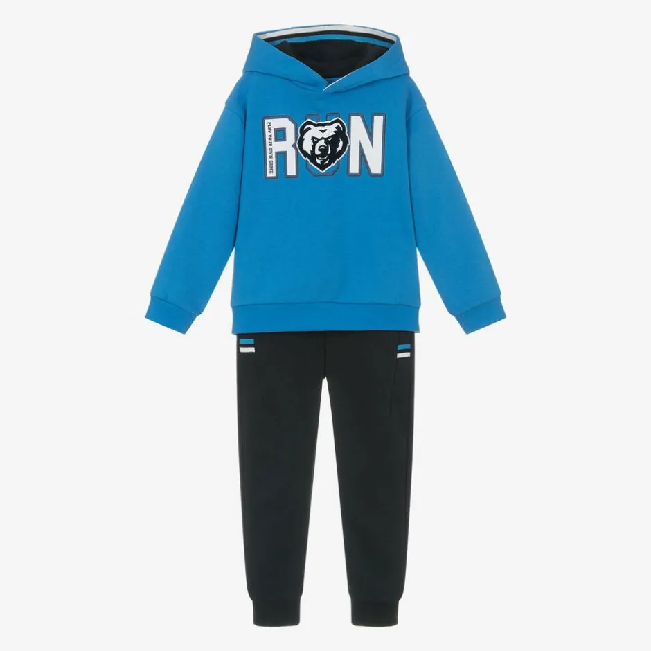 Cosy blue tracksuit for boys by Mayoral, with a large "run" logo print. It is made in mid-weight cotton jersey, with a soft brushed inside. The joggers have an elasticated waist that can be adjusted with the drawstring for a secure fit.