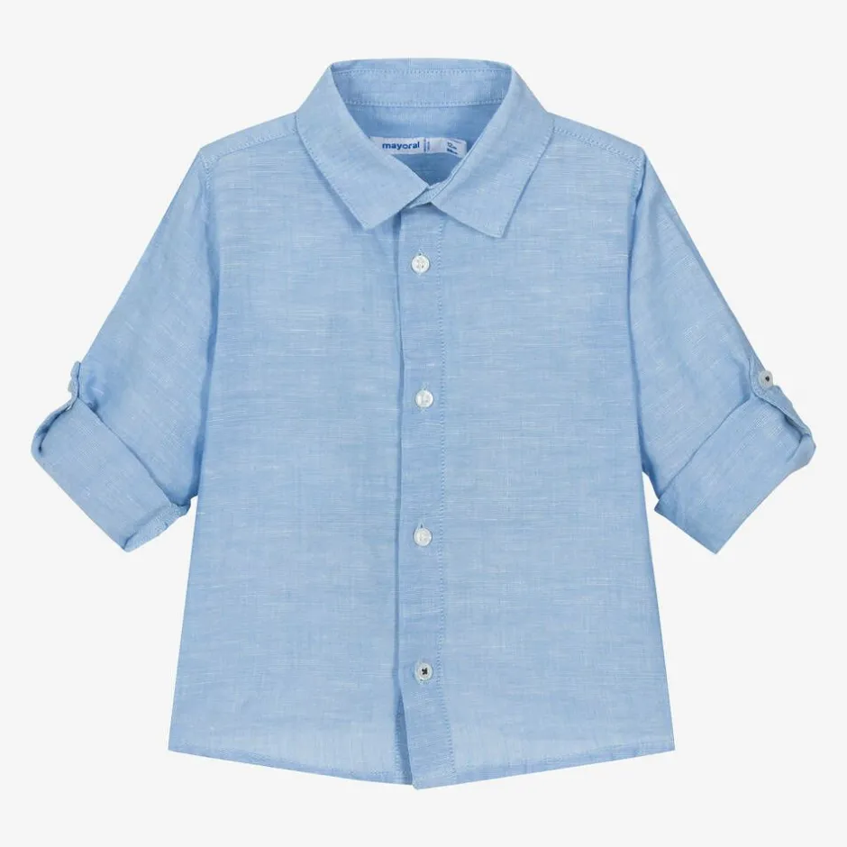 Smart light blue shirt for little boys by Mayoral, woven in a comfortable cotton and linen blend. It has a pointed collar and front button fastenings. The long sleeves have a useful button tab, allowing them to be turned up and fixed in place.