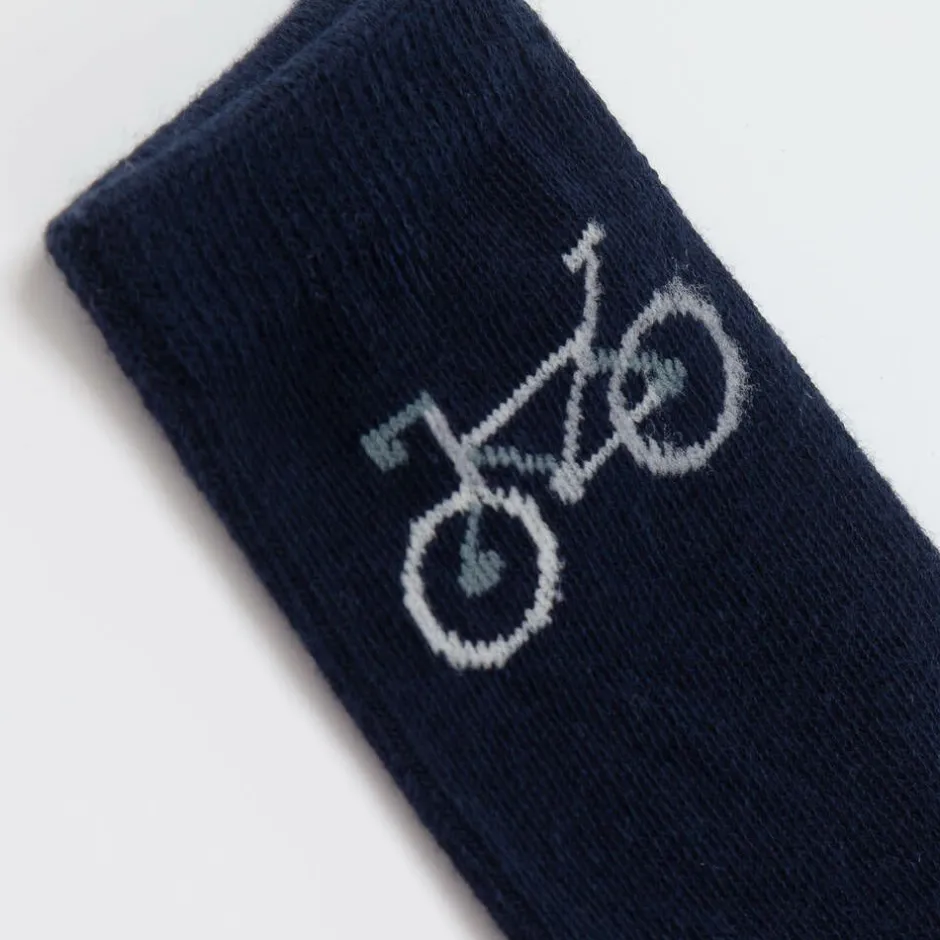 Pack of three pairs of navy blue and grey socks for boys by Spanish brand, Mayoral. Made in a soft cotton blend, two pairs have a patterned knit, whilst the navy pair has jacquard bicycles on the cuffs. These socks contain organic cotton.