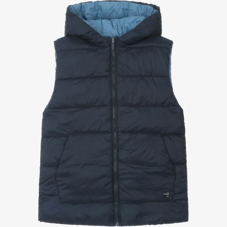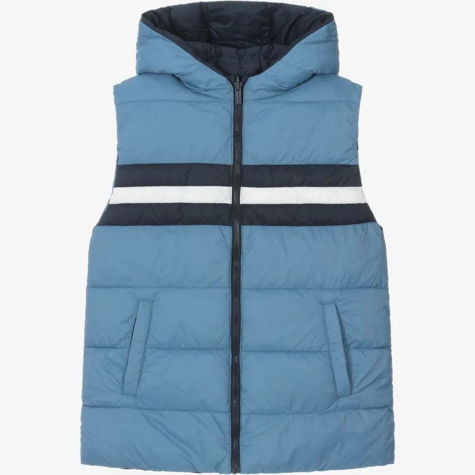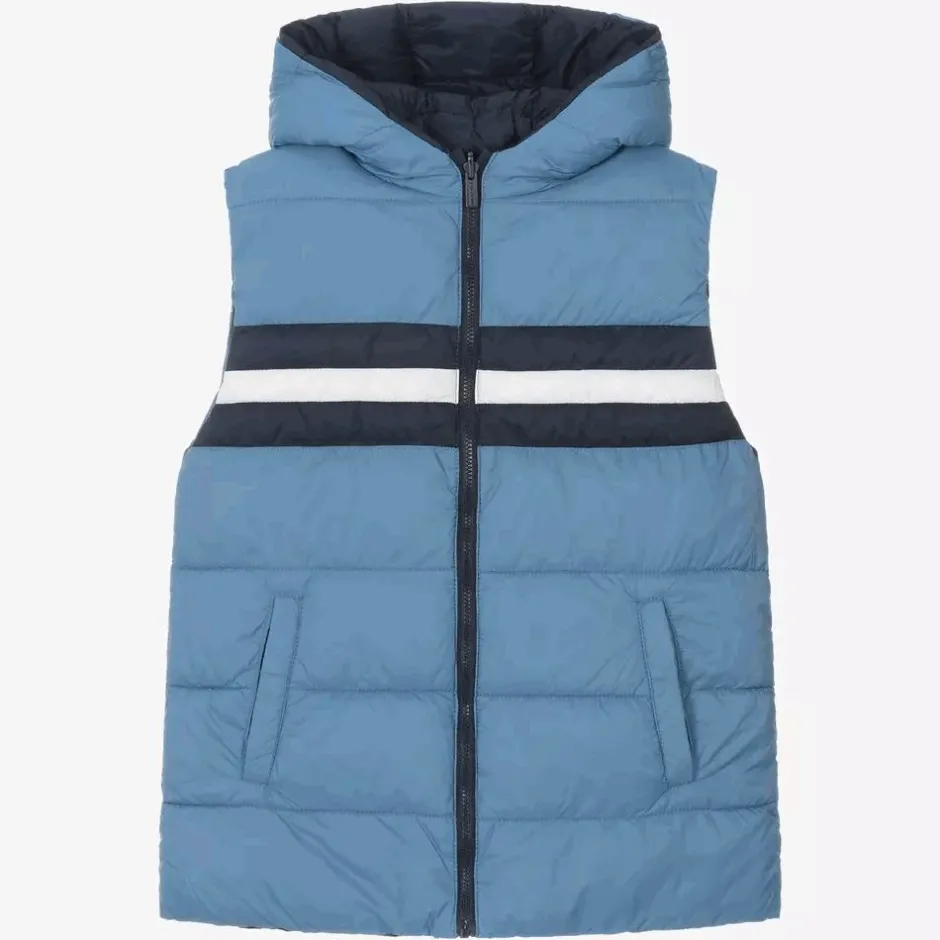 In a reversible style, this blue gilet for boys is from Mayoral. This lightweight gilet is a great layering option on cold days, with a protective hood and pockets on both sides.