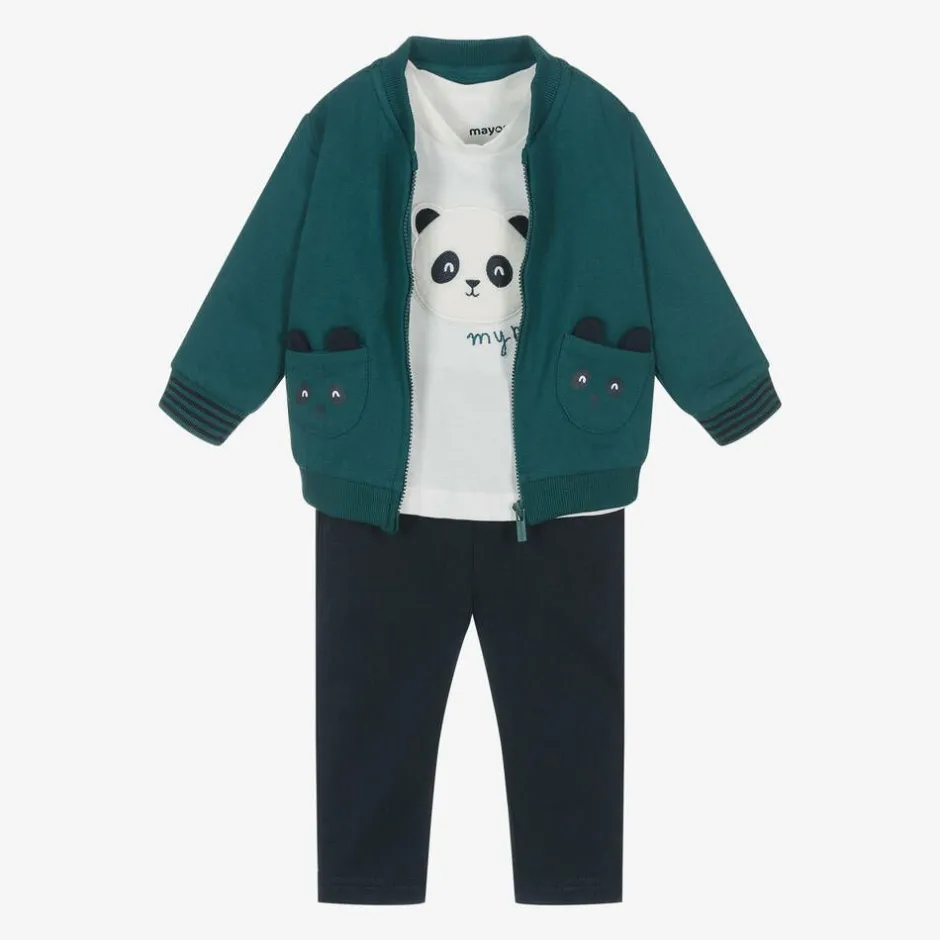 Fun, comfortable teal green and navy blue tracksuit set for little boys by Mayoral, made in soft cotton blend jersey. The zip-up top has cute patch pockets in a panda design with ear appliqués and contrasting blue striped cuffs. The coordinating joggers feature pockets on the side seams, a drawstring waistband for an adjustable fit and reinforced knees. Completing the set is an ivory long-sleeved top with a fluffy panda patch and shoulder popper fastenings.