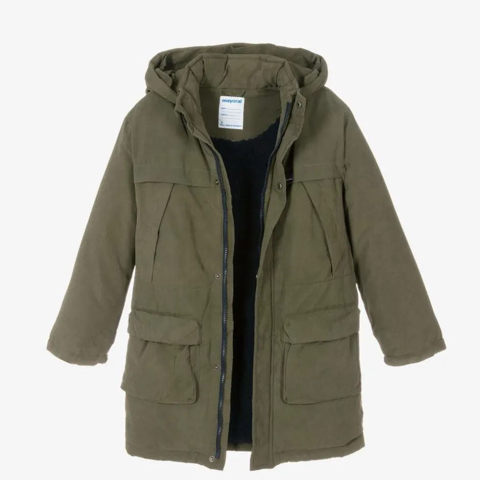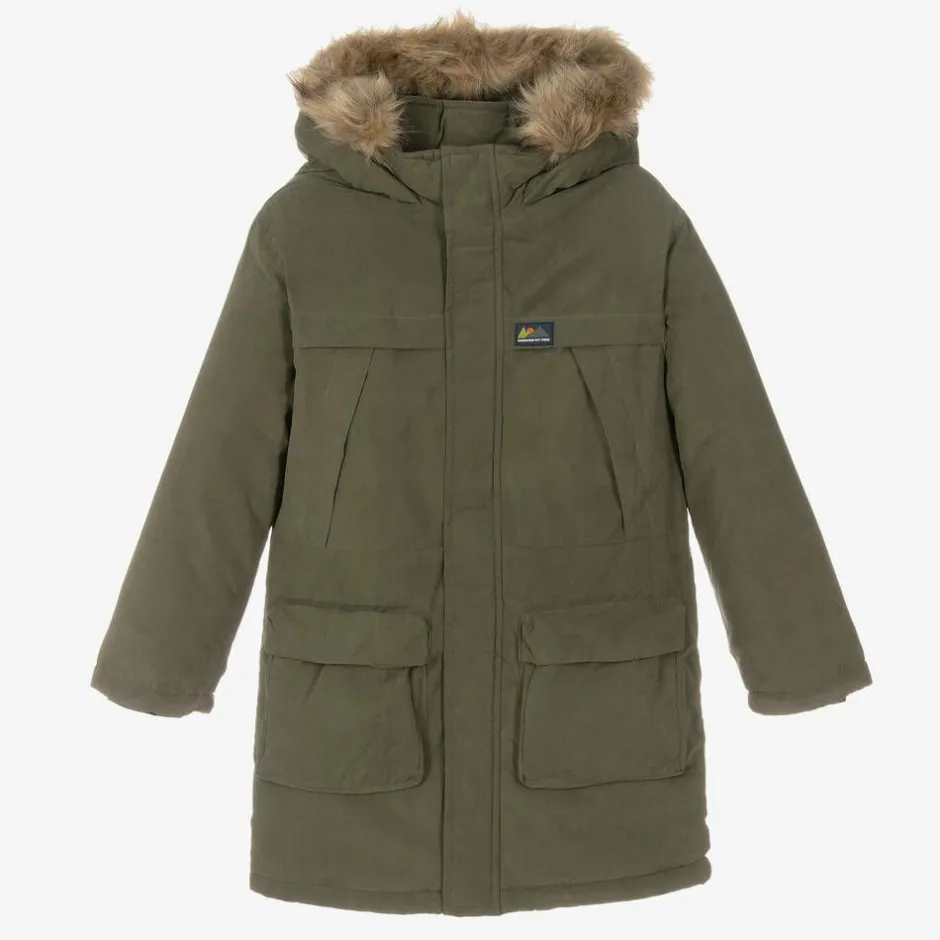 Khaki green parka coat for boys by Mayoral, with a lovely soft feel. Lined in sherpa fleece and padded for warmth, it has a fixed hood with a detachable beige faux fur trim that fixes on with a zip. To help keep out chilly winds, it has internal ribbed cuffs and a popper fastening storm flap over the front zip fastening. For a comfortable fit, there is a drawstring waist with internal toggle adjustors. The coat has useful front pockets and a rubberised slogan badge on the chest.