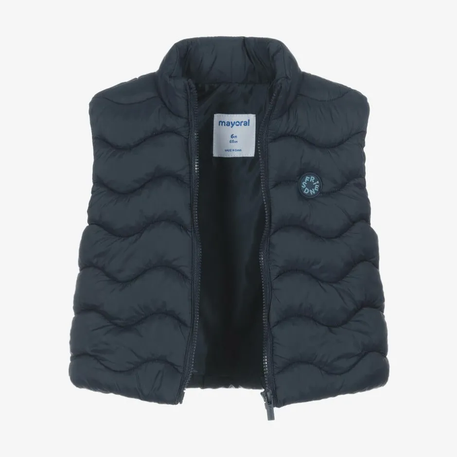A casual and comfortable trouser set for little boys by Mayoral. The ivory sweatshirt and the grey marl joggers are made in a soft cotton-blend jersey, with a cosy fleecy inside. The sweatshirt has a fun 'Jam in the City' motif on the front, with popper fastenings on one shoulder. The trousers have an elasticated drawstring waist and durable reinforced knees. Providing an extra layer of warmth, the set is completed with a silky smooth, navy blue puffer gilet.