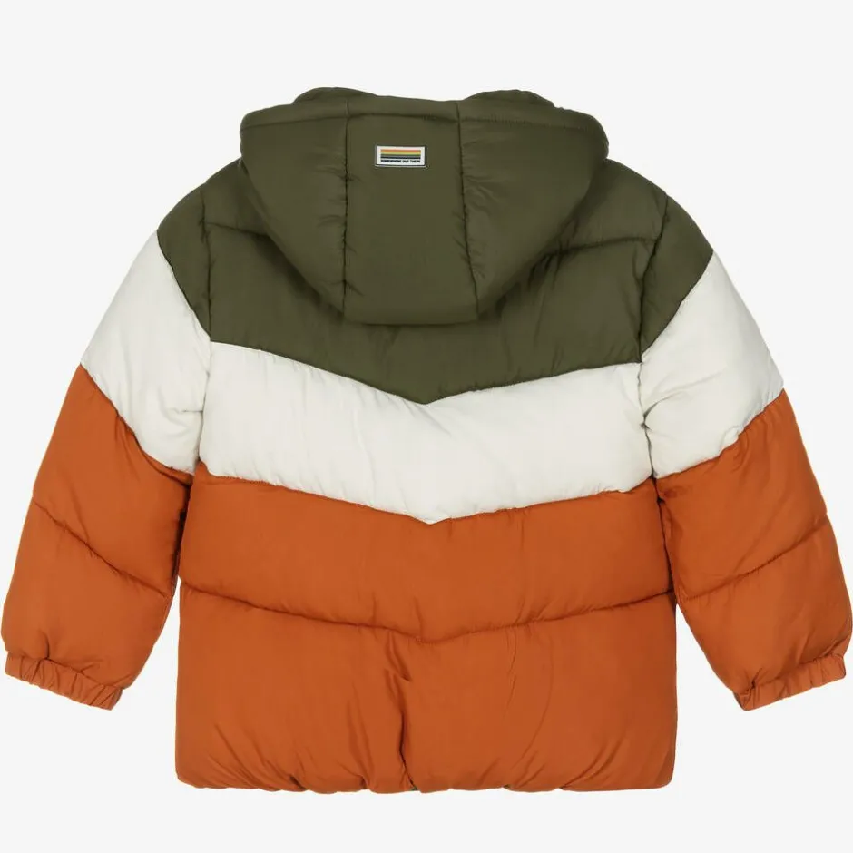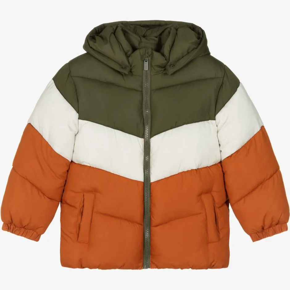 A cool puffer coat for boys by Mayoral, in a khaki green, ivory and orange colourblock design. Ideal for colder months, this padded style has a soft fleecy inside and elasticated trims to keep chilly winds out. The detachable hood can be fastened with poppers and removed easily when the weather turns drier. It has a front zip fastening, and front pockets to keep hands warm.