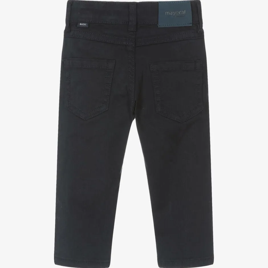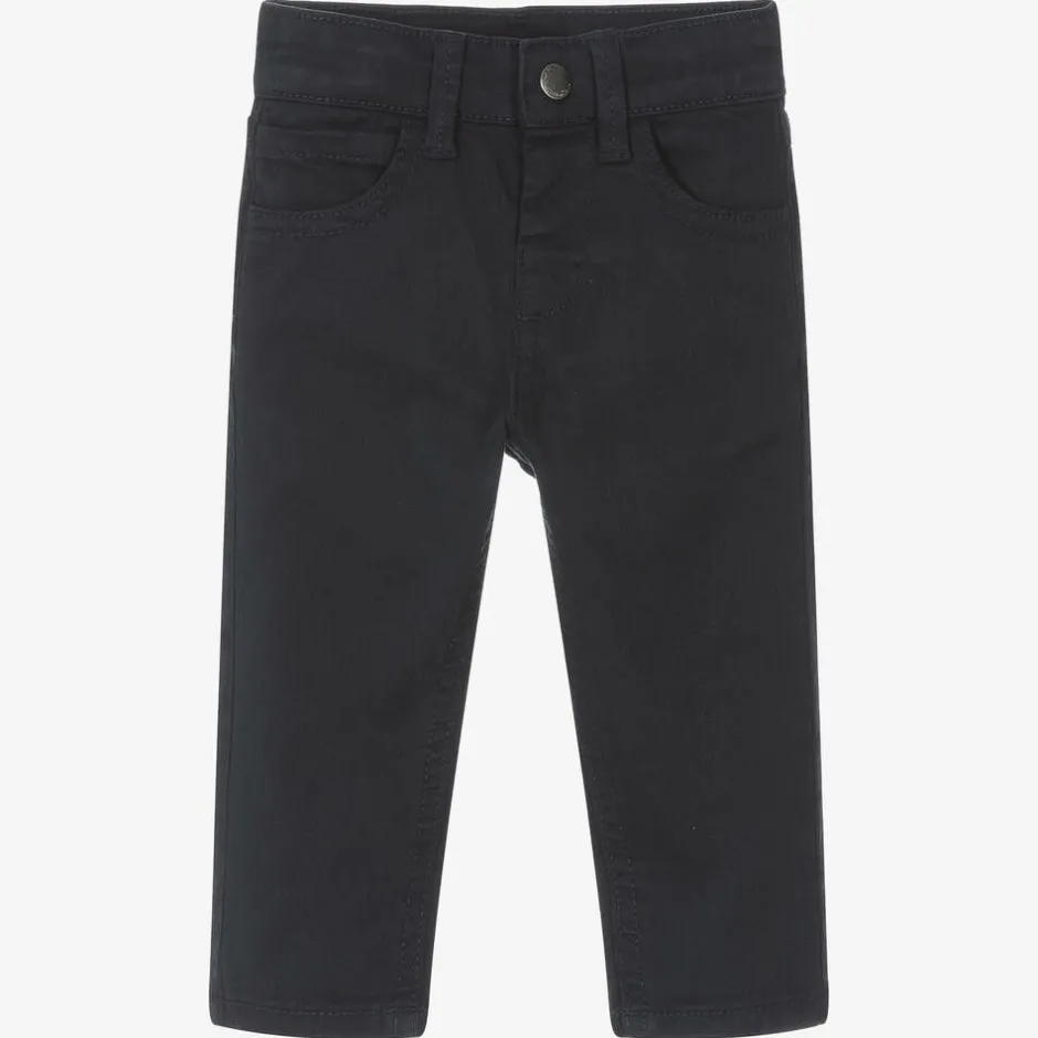 Classic navy blue cotton jeans for little boys by Mayoral, made from soft brushed twill. They have the standard five-pocket detailing, with belt loops and a front popper fastening for easy dressing. There is a branded foam patch on the back, and an adjustable waist for a comfortable fit.