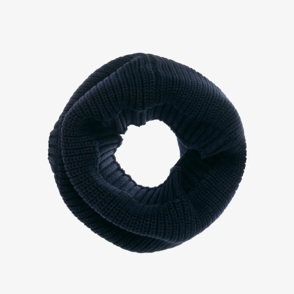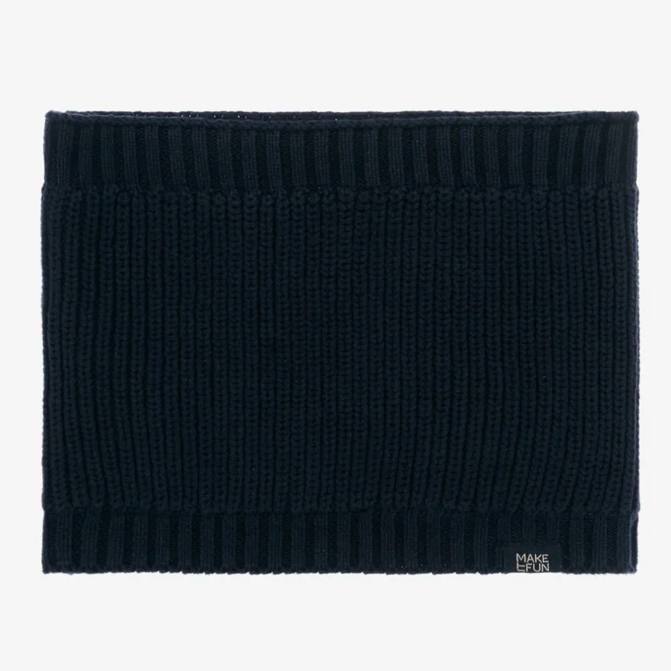 Navy blue snood for boys by Mayoral, knitted in soft cotton in a mid-weight ribbed design. Cosy and comfortable, it has a warm polar fleece lining, ribbed trims and a navy blue 'Make It Fun' tab on the front.