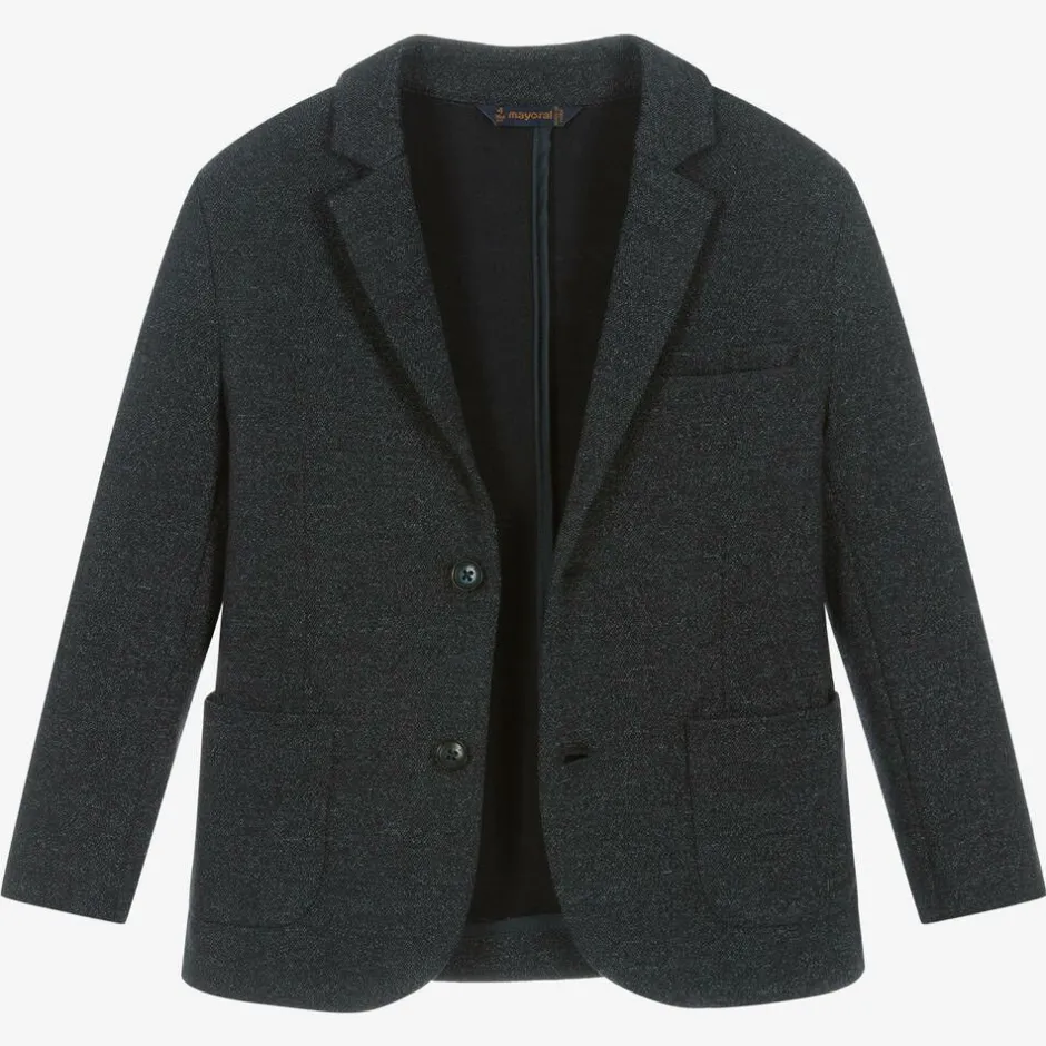 Smart navy blue blazer for boys by Mayoral, made in soft cotton blend jersey for comfort. For a classic look, it has lapels and front pockets. It fastens with simple buttons on the front, discreetly embossed with the brand's logo.
