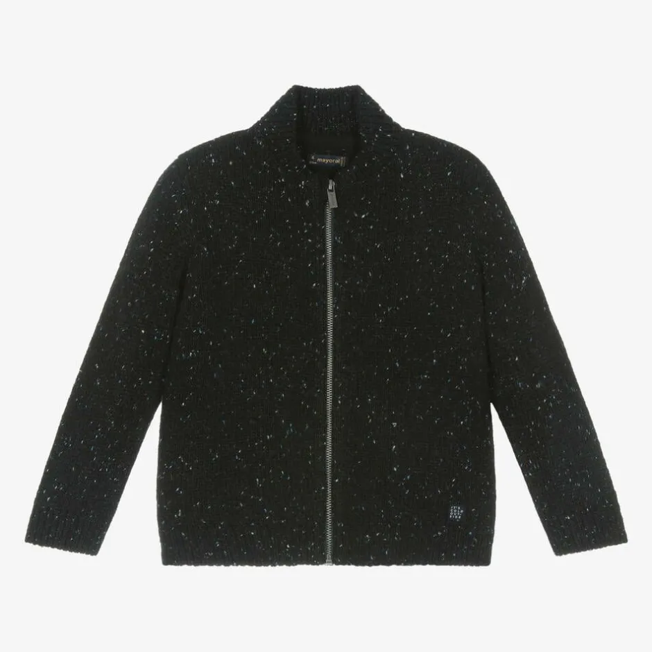 A dark navy blue zip-up top for boys by Spanish brand Mayoral, ideal to wear as an extra layer on cooler days. Knitted with little speckles for contrast, it has added wool in the yarn for extra cosiness and a little rubber patch by the hem.