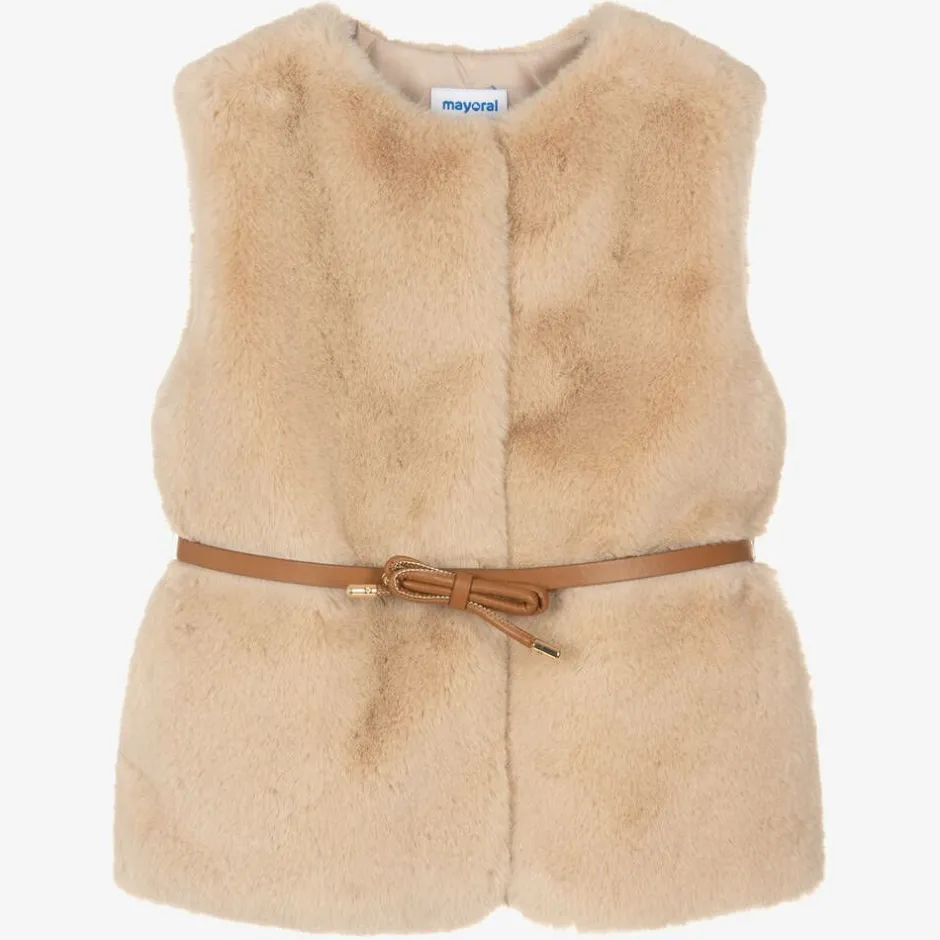 Super stylish beige faux fur gilet for girls from Spanish brand, Mayoral. Beautifully soft, this long-line gilet comes with a detachable and adjustable tan brown faux leather belt for a chic silhouette. It fastens with discreet poppers and has a lovely beige satin lining.