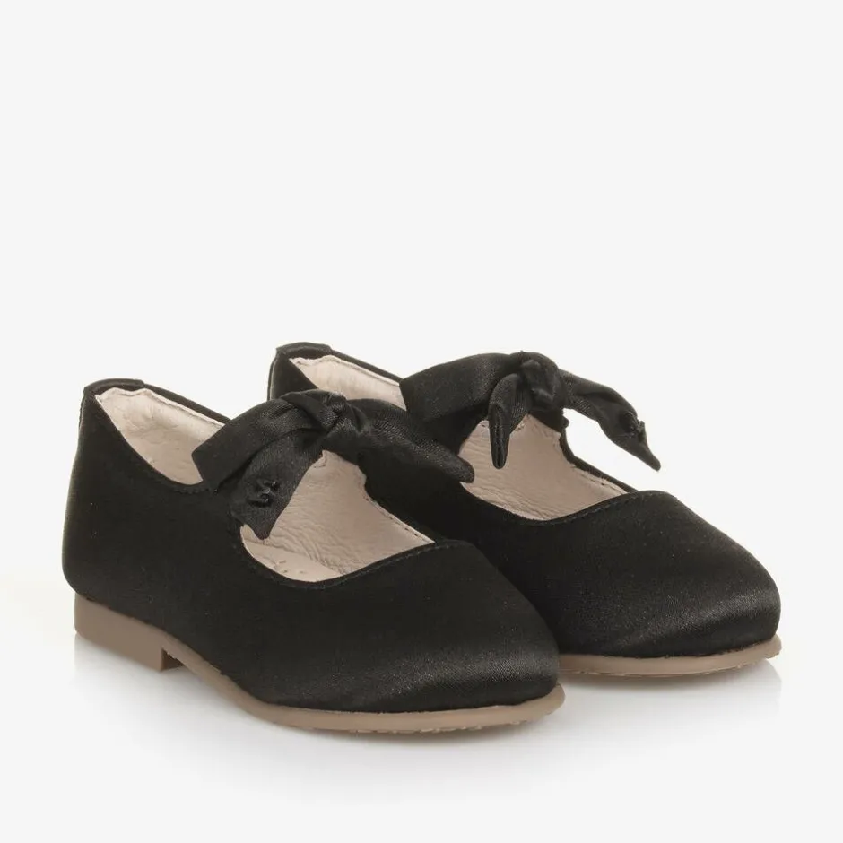 Gorgeous black satin shoes for girls by Mayoral, with a pretty sheen. Easy to slip on, this sweet style has an elasticated strap across the foot, decorated with a cute bow. They are lined in soft leather, with a lightly cushioned insole and non-slip rubber outer sole for good grip.
