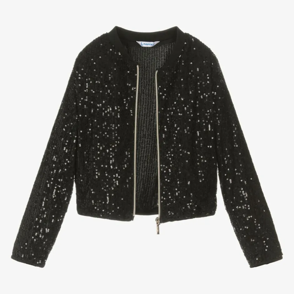 Black zip-up top for older girls by Mayoral, stitched with shiny sequins to elevate this casual bomber style. The sequins are sewn onto fine, lightweight tulle and the top is comfortably lined in soft jersey. Fastening with a gold-tone zip and branded pull, it has a ribbed collar and jersey trim on the elasticated cuffs and hem.