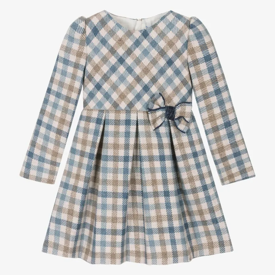 Blue and light beige check dress for girls by Mayoral, woven with metallic gold thread for a gentle shimmer. A classic style, this knee-length dress has long sleeves with puff shoulders. The decorative bow on the waist has a soft velvet trim and the pleated skirt is fully lined with lightweight, cotton-blend fabric for added comfort. It fastens neatly on the back with a zip.