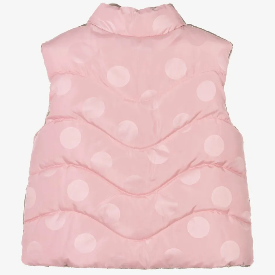 Fun gold and pink reversible gilet for little girls by Mayoral. Lightly padded for added warmth without extra weight, this quilted gilet fastens with a zip on the front. The gold side has concealed pockets in the side seams and is finished with a delicate logo tile on the chest, whilst the pink side is patterned with subtle tonal polka dots for a pretty look.