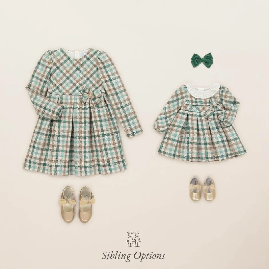 A green and beige check dress for little girls by Mayoral. Woven in a soft cotton and wool blend with a subtle gold sparkle, it is lined with lightweight cotton for added comfort. The waistband has a pretty appliqué bow with branded detailing and green piping for a sweet look. Fastening with a concealed zip on the back, it has a white frilled collar and puffed long sleeves with stretchy cuffs for extra comfort.