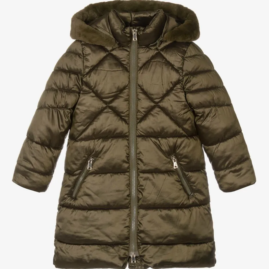 A green puffer coat for girls from Mayoral, with a lustre effect and gold-tone hardware. This hooded coat is made in silky-soft fabric and padded with cosy, mid-weight insulation. For versatile wear, the faux fur-trimmed hood is removable and secures with a zip. The body and zip-up pockets are lined with super-soft plush velour for added warmth.
