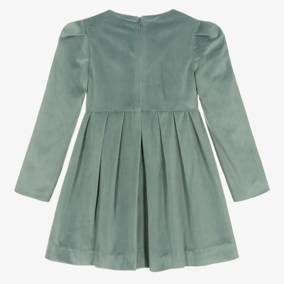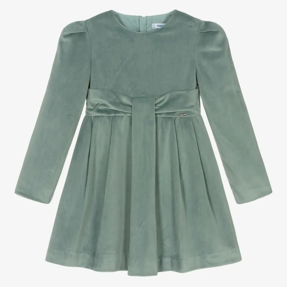 A smart jade green dress for girls by Mayoral, made in beautifully soft velvet. Lovely for a special occasion, this long-sleeved style has a pleated skirt and gently gathered fabric on the shoulders. There is a branded charm on the waistline and a concealed zip fastening on the back. This knee-length dress is lined with lightweight fabric for added comfort.