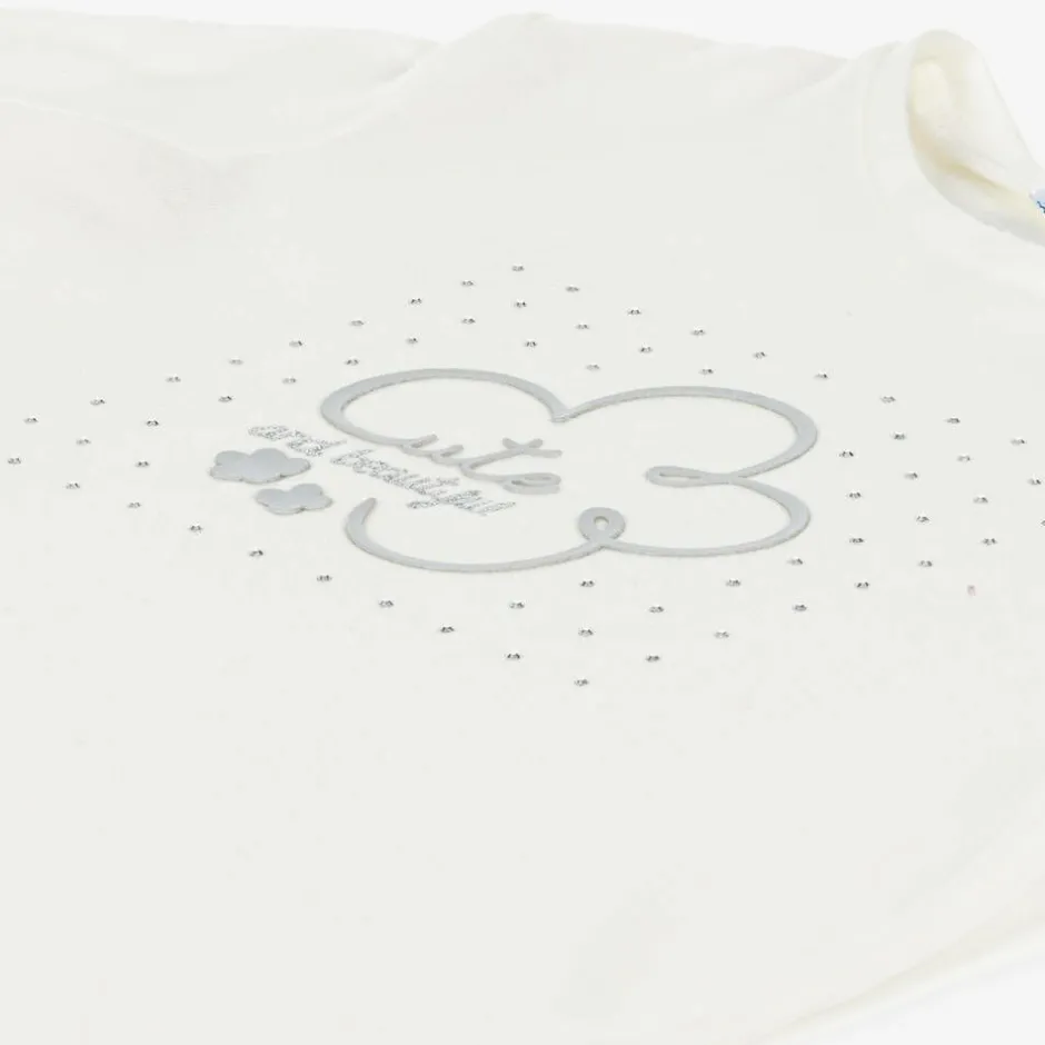 Ivory top for girls by Mayoral, made in soft and stretchy cotton jersey. This long-sleeved style has a slogan design on the front which reads 'Cute and beautiful' in the centre. This is surrounded by silver diamantés for extra sparkle.