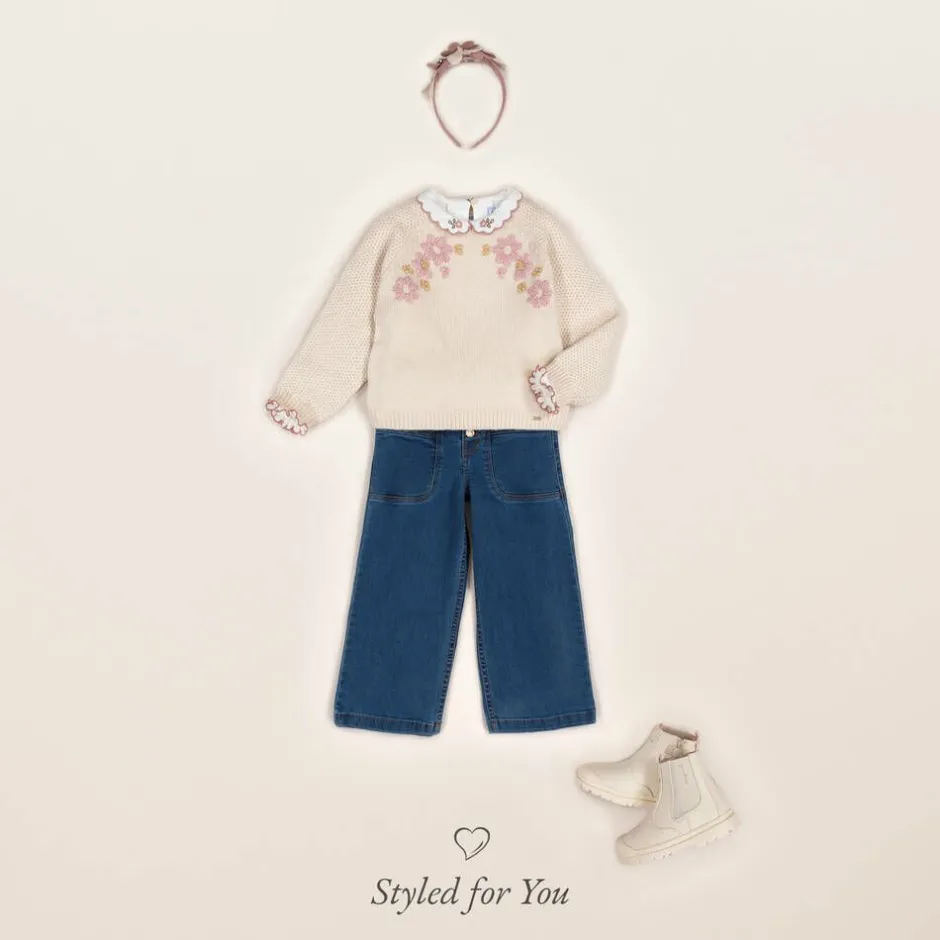 Ivory blouse for girls by Mayoral, made in soft and comfortable cotton jersey with a brushed feel. It has a sweet scalloped collar trimmed with pink edging and pretty pink and green floral embroidery. There are neat pintucks on the front and gently puffed long sleeves with elasticated cuffs and matching pink scalloped edging. It fastens neatly on the back with a single button.