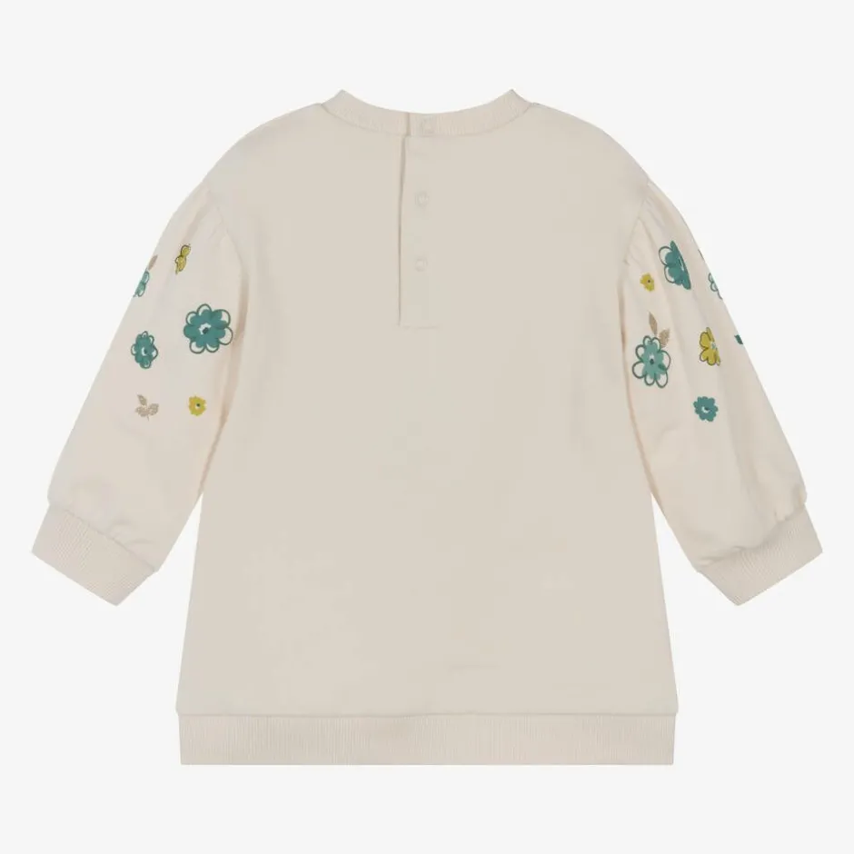 A lovely ivory sweatshirt dress for little girls by Mayoral, made from a soft mid-weight cotton jersey with a fleecy interior. It is printed with a cute 'girl cuddling her cats' design on the front, surrounded with green flowers and gold glitter accents for added sparkle. Casually styled, it has dropped shoulder long sleeves, ribbed trims, and popper fastenings on the back.