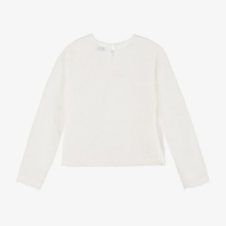 Pretty ivory long-sleeved top for older girls by Mayoral. Soft and stretchy, it is made in a lightweight knit with a fluffy look and silver threads for added sparkle. It has a single button fastening on the back. This versatile top comes with a cotton jersey camisole, which can also be worn separately.