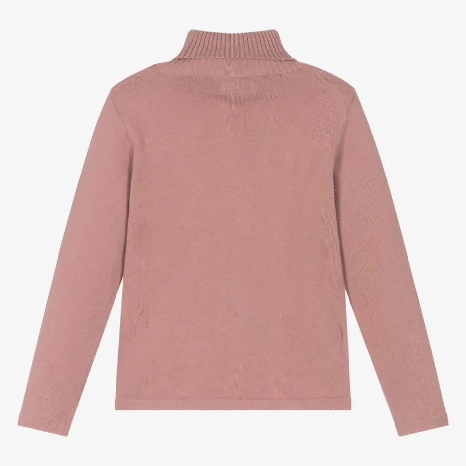 Dusky pink roll neck sweater for older girls by Mayoral, knitted in a soft cotton blend. Cosy and comfortable, with a classic ribbed roll neck, it has a metal logo bar by the front hem.