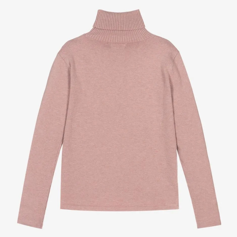 Dusty pink roll neck sweater for older girls by Mayoral, knitted in a soft cotton blend. Cosy and comfortable, with a classic ribbed roll neck, it has a metal logo bar by the front hem.