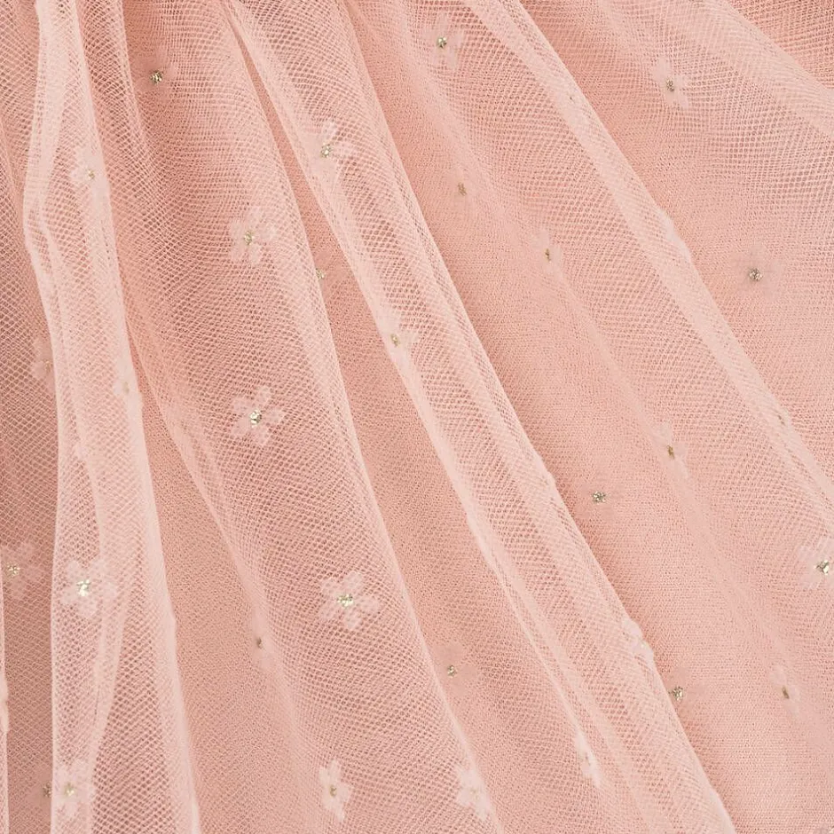 Dusky pink tutu skirt for little girls from Mayoral, layered with lightweight tulle for a pretty look. The skirt is covered with glittery silver and pale pink flowers. It has a stretchy velvet waistband and is lined with soft cotton fabric to ensure little ones feel comfortable.