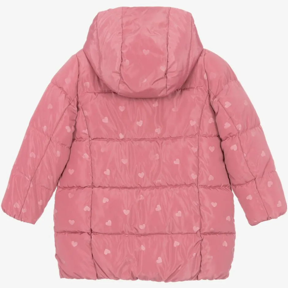 Stylish pink heart-patterned puffer coat for girls by Mayoral, warmly padded and lined in cosy, plush fleece for extra cosiness. The front pockets are also lined in plush fleece to keep little hands extra toasty, whilst the fixed, padded hood provides extra protection from the weather. The cuffs and hem are both elasticated to keep out cold chills, as does the covered zip secured with poppers on the front.
