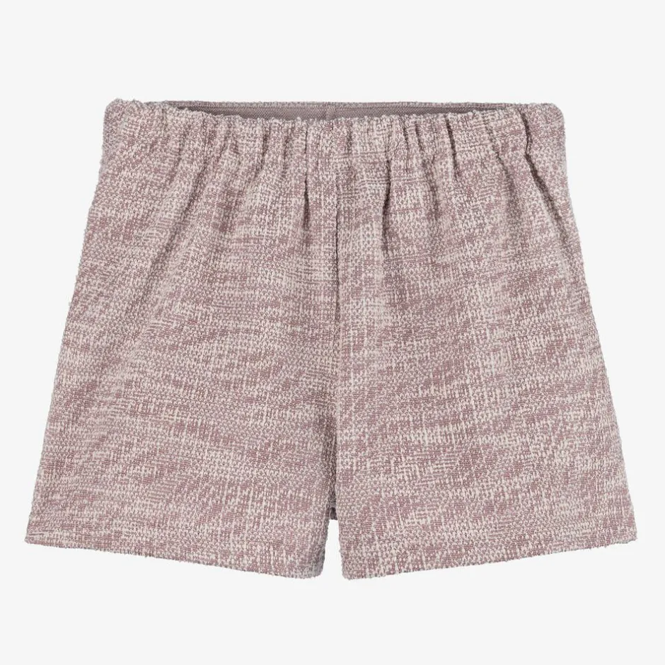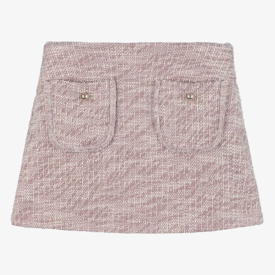 Pink and ivory tweed effect skort for girls by Mayoral. It is made in a mid-weight, cotton blend jersey with glittery threads for added sparkle. Casual but stylish, it has patch pockets on the front, trimmed with pretty frayed detailing and faux buttons. It has a useful adjustable waist for a comfortable fit.