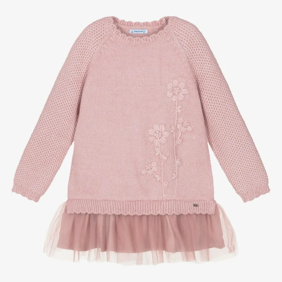 Pink dress for girls by Mayoral, made in a soft knit with added silver threads for a touch of sparkle. The long-sleeves have a honeycomb pattern and there are sweet scalloped, ribbed trims. Made in layers of soft tulle, the dropped hem has a cotton jersey lining and for a pretty finish, there is an embroidered floral design on the front. This item contains recycled fibres.