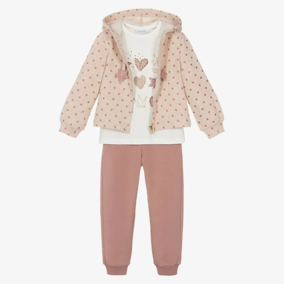 Girls pink and beige tracksuit set by Mayoral, made in comfortable cotton-blend jersey. Patterned with glittery pink stars, the zip-up hoodie has lightly ribbed cuffs and decorative faux drawstring ties on the neckline. The plain bottoms have an elasticated waist for extra comfort. Worn underneath, the ivory top has a fun graphic print on the front, featuring pink hearts and glittery gold crowns.