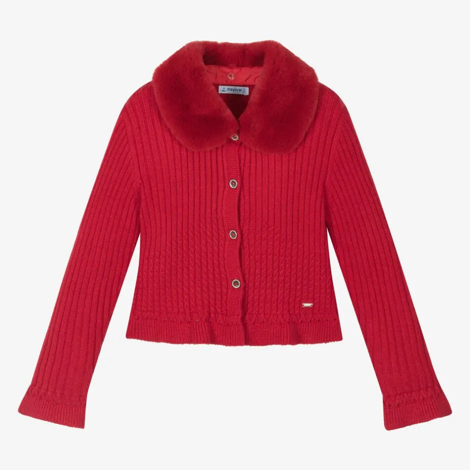 Deep red ribbed cardigan for girls by Mayoral, with cable-knit details. Made in a soft blend with viscose, this cardigan has a removable, button-on collar in faux fur. It has silver-hued buttons to fasten on the front. This item contains recycled fibres.