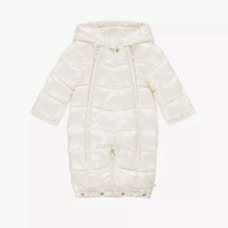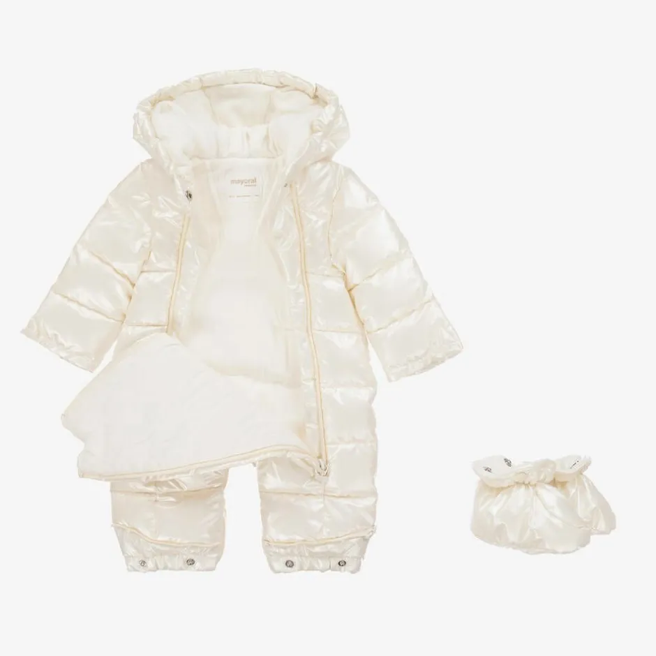 Ivory snowsuit for baby girls by Spanish brand Mayoral, with a lustrous sheen. Beautifully warm, it has a fixed hood and mid-weight padding, with detachable booties for extra cosiness. Fully lined in jersey for comfort, it has a double front zip fastening for easy dressing. The zip fastening between the legs and poppers securing the booties enables the snowsuit to become a snowbag.