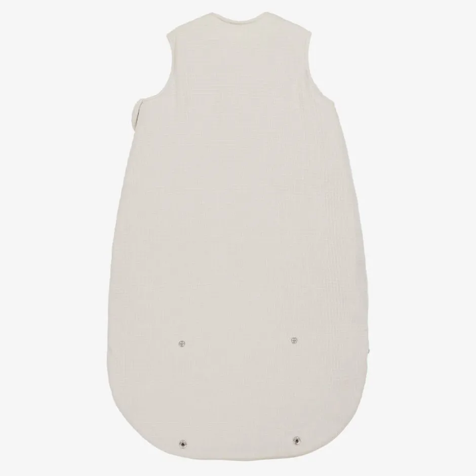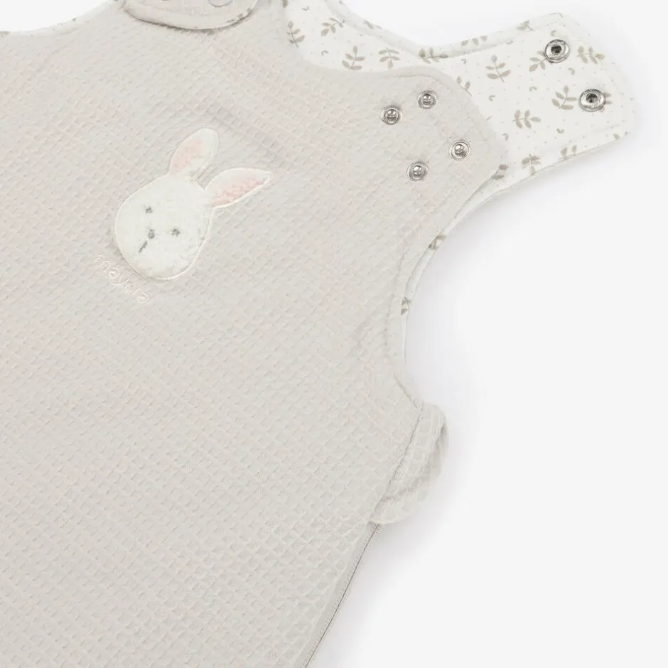 Cute ivory sleeping bag for baby boys and girls by Spanish brand Mayoral, with white bunny appliqué and embroidered logo on the front. Made in soft cotton-blend jersey with a textured square pattern, it is lightly padded for cosiness and lined in white jersey with a beige leaf print. Fastening with a zip on one side and along the bottom, it also has adjustable poppers on the shoulders for added practicality. The size of the sleeping bag can be altered by folding up and fastening the bottom with poppers.
