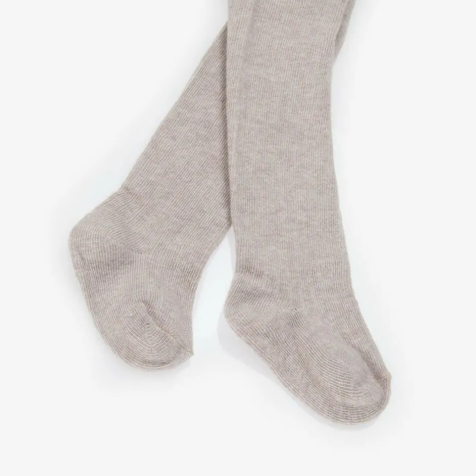 Beige ribbed tights for baby boys and girls by Mayoral, knitted in a soft and stretchy organic cotton blend. They have a gently ribbed waistband for a comfortable fit.
