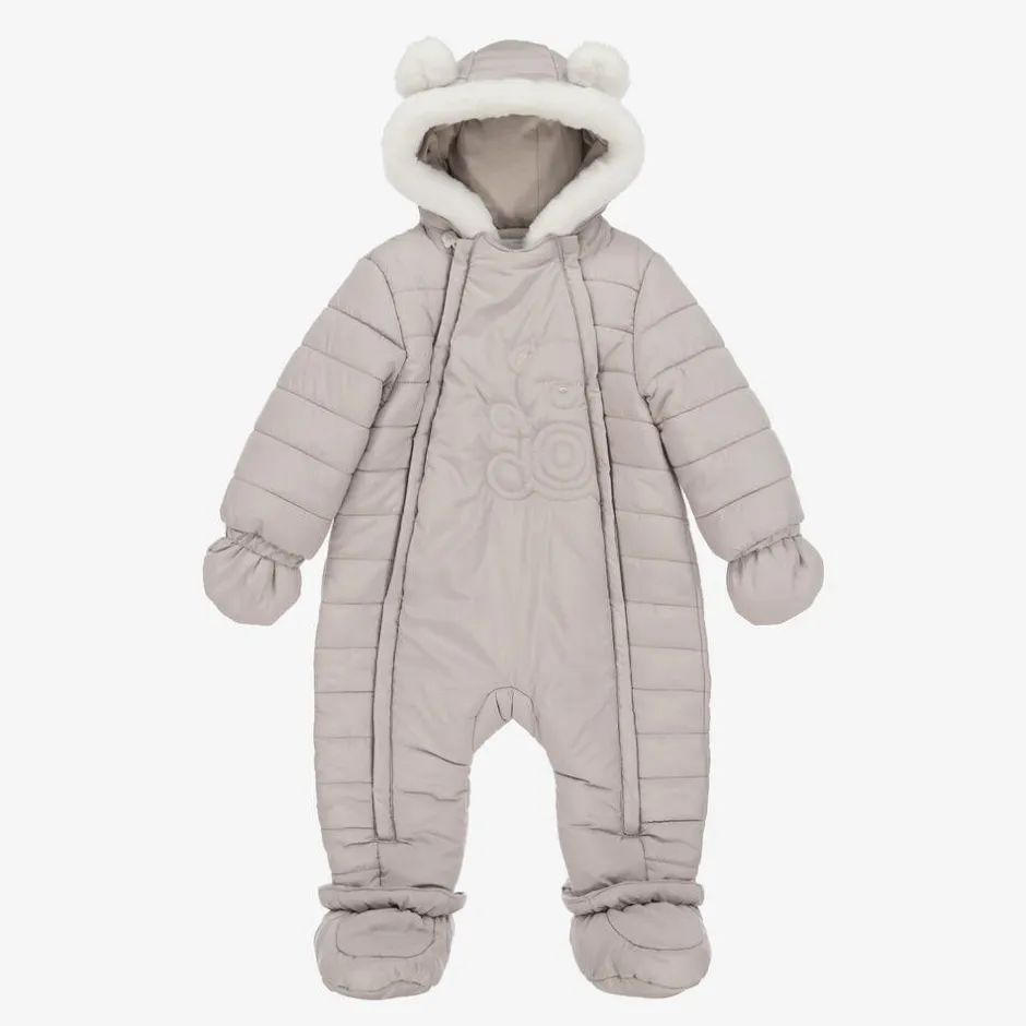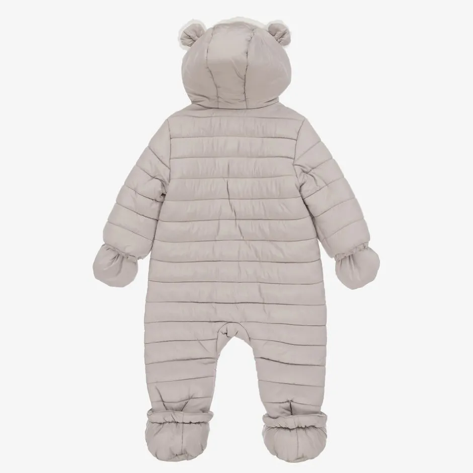 Adorable beige quilted snowsuit for baby boys and girls from Spanish brand, Mayoral. Silky smooth and warmly padded, it has a soft and comfortable cotton jersey lining and a useful double front zip fastening. For added protection, the neck opening secures with a popper, the cuffs are elasticated and smaller sizes come with detachable mittens and booties. To complete the cute look, there is an embroidered teddy design on the front, with faux fur trim and 3D ears on the hood.