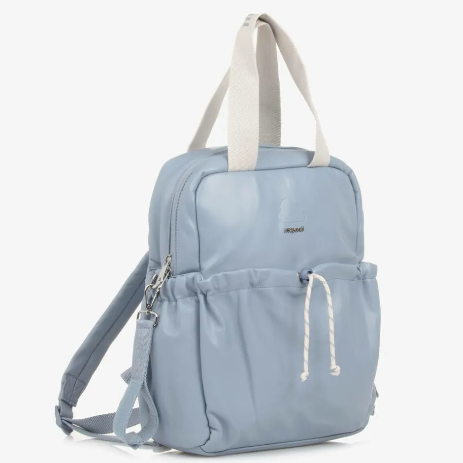 A dusky blue changing backpack by Mayoral, made in faux leather and lined in silky logo-patterned twill. Cleverly designed to store baby's essentials, it has a velcro-closing side pocket suitable for wipes or tissues, an inner foil-lined, insulated bottle holder, and multiple pockets. This practical bag has a two-way zip fastening and a front pocket with a drawcord detail. The bag includes a silky, padded changing mat. The branded carry handles and clip-on buggy straps are made in durable canvas, while the adjustable shoulder straps are padded for comfort.