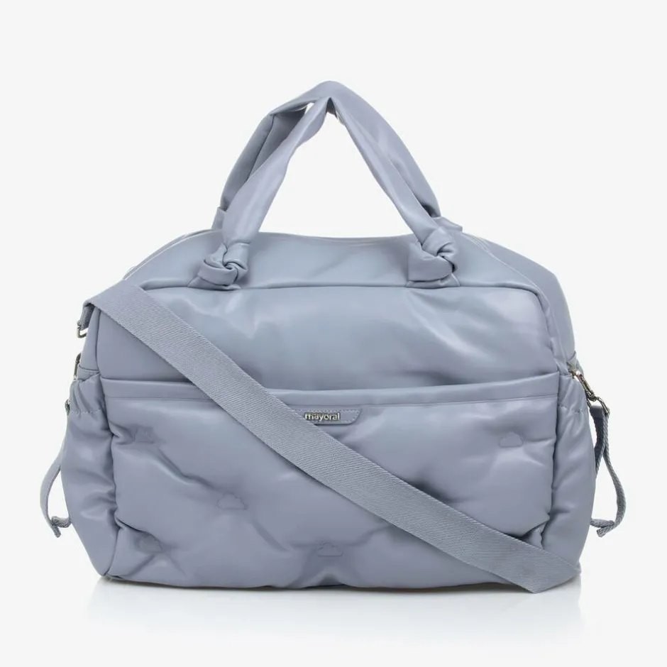 Blue zip-up changing bag by Mayoral, with silver-coloured hardware. Soft and durable, this faux leather bag has multiple inner and outer pockets, some of which fasten with poppers and zips, for neat and tidy storage. One side is embossed with clouds and detailed with a logo patch. It has a silky lining, knotted details on the handles and a removable shoulder strap. Two clip-on buggy straps allow the bag to be attached to the stroller handles.