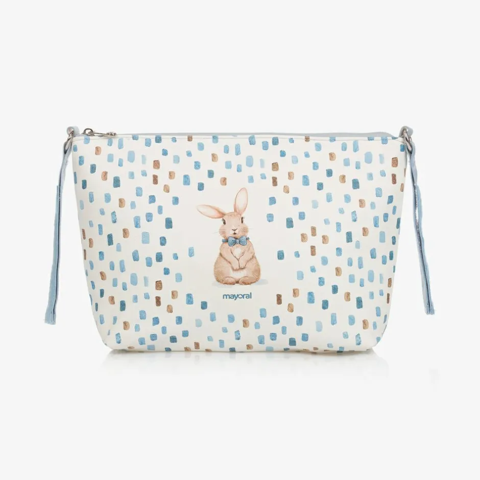 Ivory and blue stroller bag by Mayoral Newborn. Made with soft faux leather, it has a sweet bunny design, and is decorated with an all-over beige and blue dotted pattern. Lined with smooth fabric, it has two inner compartments and three pockets. Practical and useful, it has two outer pockets and velcro-fastening stroller straps.