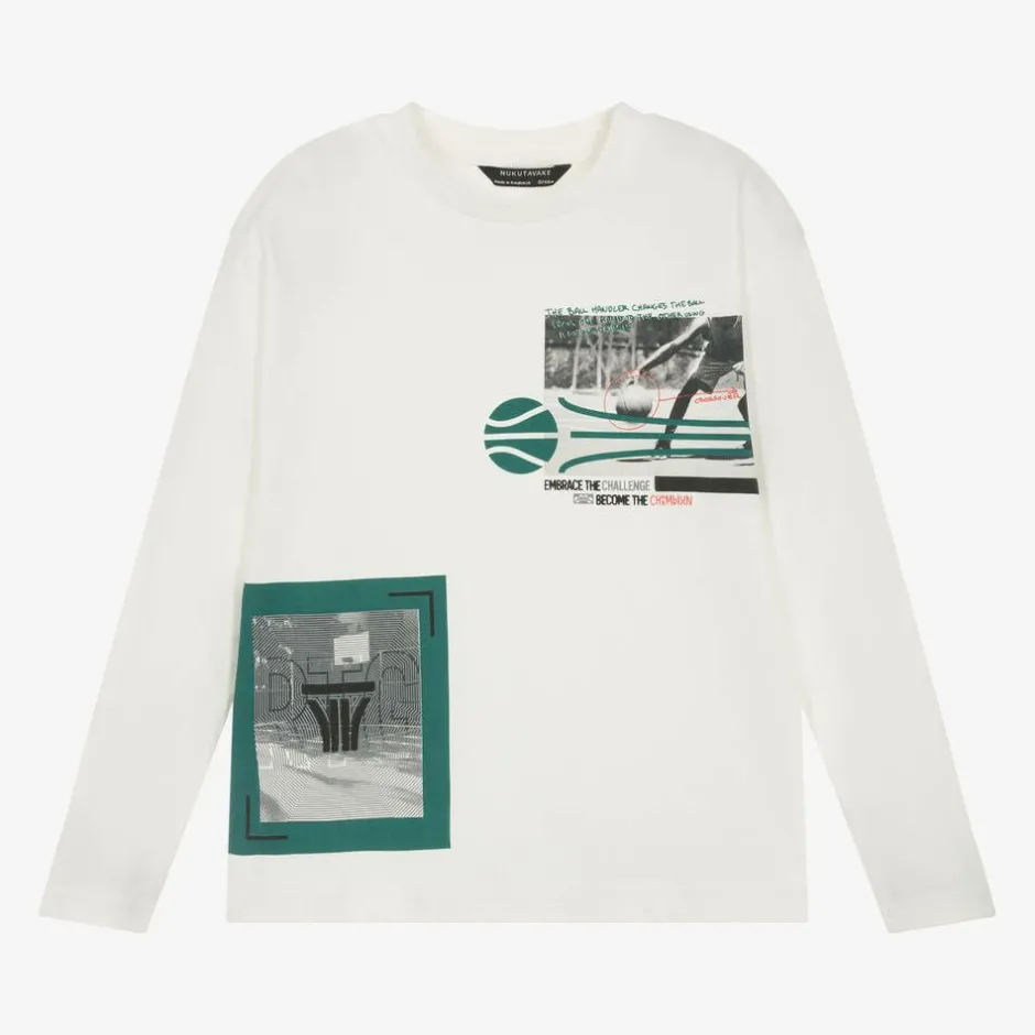 Ivory top for older boys by Mayoral Nukutavake, made in comfortable cotton jersey. It is printed with cool basketball graphics on the front in green and black.