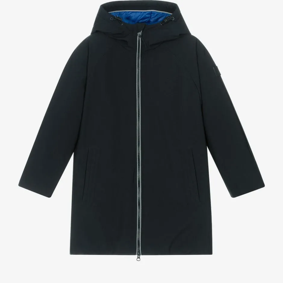 Navy blue zip-fastening parka coat for older boys from Mayoral Nukutavake. Simply stylish, it is made in smooth woven fabric and is lightly padded with a bright blue quilted satin lining. The hood is adjustable and the sleeves have ribbed cuffs for added cosy wear. The coat has front hand pockets and a useful internal pocket.
