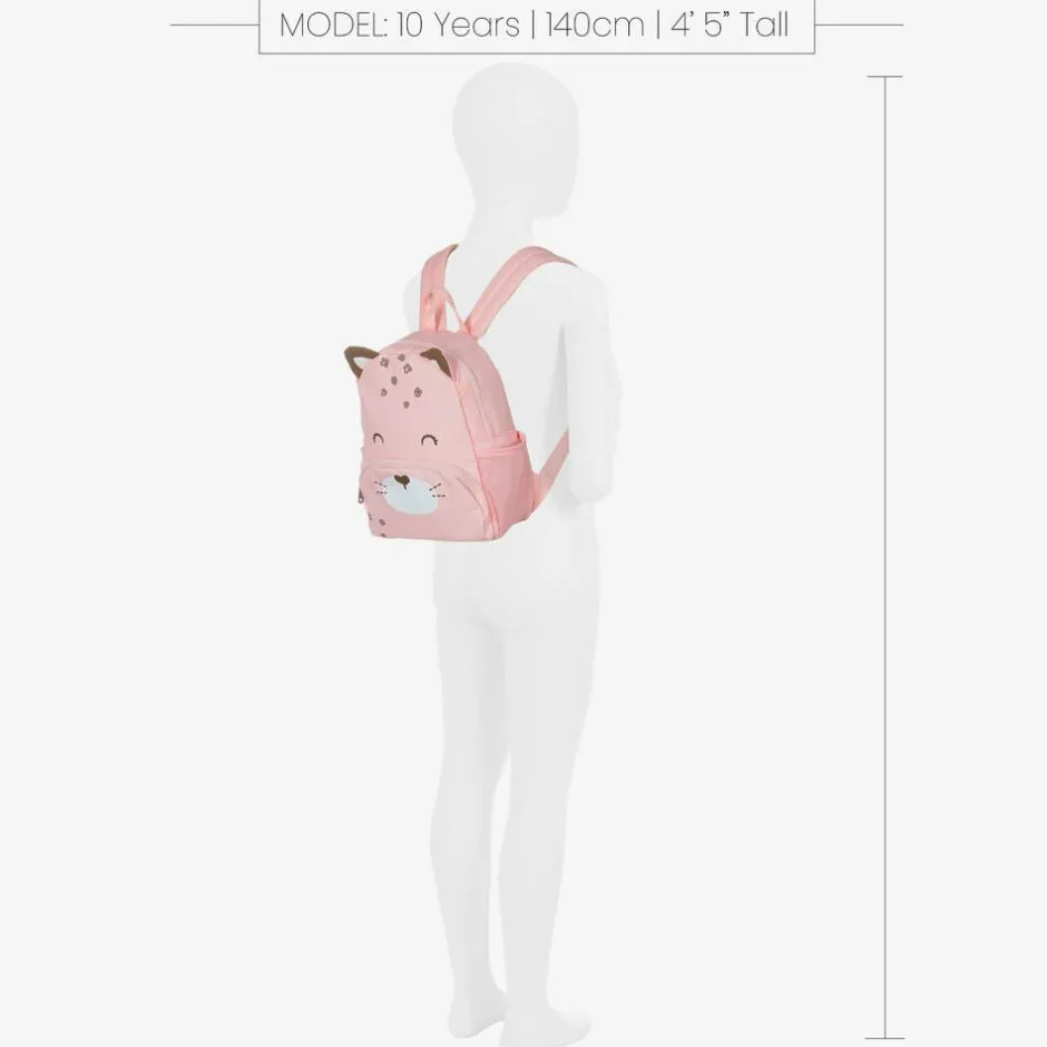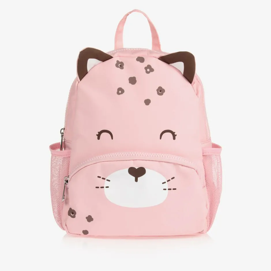 Pale pink, durable canvas backpack for girls by Mayoral, with an adorable cat face printed on the front and 3D ears. The two compartments fasten with zips, there are two mesh side pockets ideal for water bottles and a small card pouch on the back. As well as adjustable shoulder straps, there is a useful carry handle on the top.