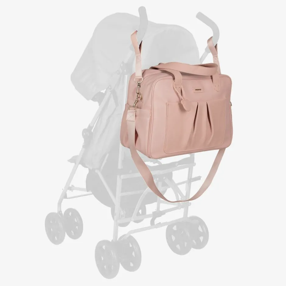 Light pink faux leather changing bag by Mayoral, with golden metal hardware and a cute teddy bear charm. Soft yet sturdy, it has a pleated popper-closing outer pocket and logo patch above, both made in soft canvas-effect fabric for an interesting multi-textural finish. This versatile bag can be carried with the detachable shoulder strap, stored on the stroller using the buggy straps, or held with the carry handles. Lined with soft twill, there are handy interior and exterior pockets for storing baby essentials.