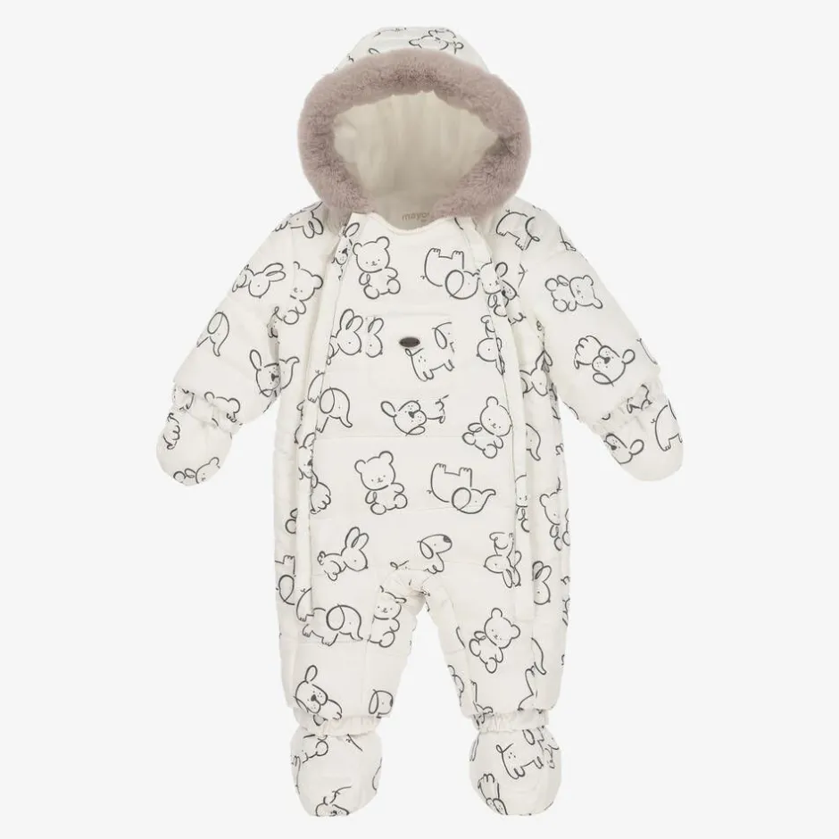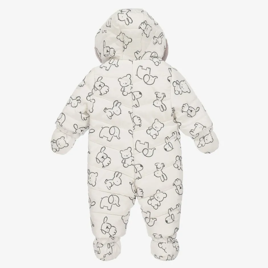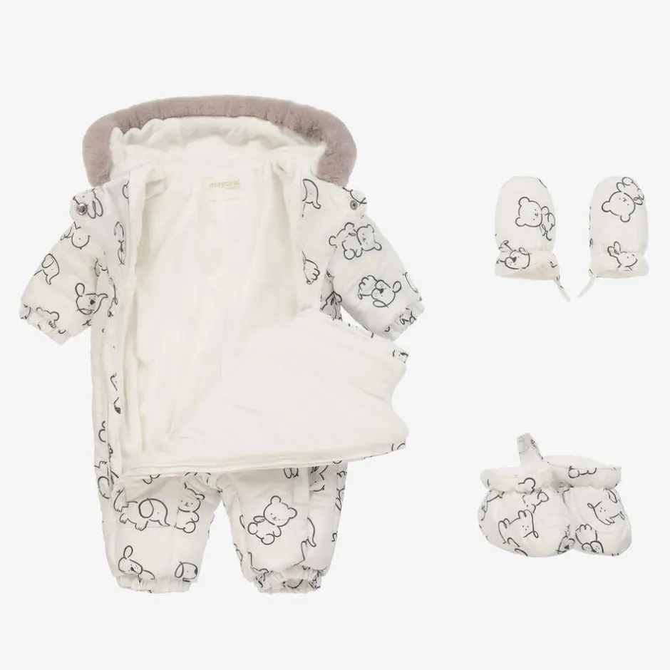 White snowsuit for baby boys and girls by Mayoral, made from silky soft fabric. Designed in a cute animal print, this padded style has a fixed hood with a warm faux fur trim and a soft plush lining. There is a double front zip fastening to help with dressing, and elasticated trims for added comfort. Securing with velcro, the detachable mittens and booties will keep little ones warm and cosy during the chillier months. This item contains recycled fibres.