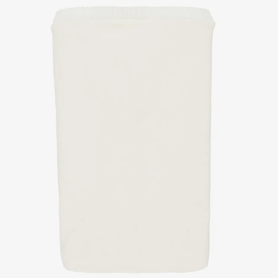 Ivory knitted baby nest for boys and girls by Spanish brand Mebi. It is lined in super soft and snuggly plush faux fur to keep your little one cosy and has a concealed front zip fastening. There are ribbed trims and decorative pom-poms on the front.