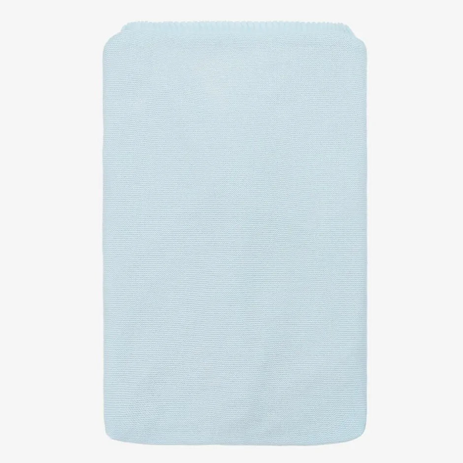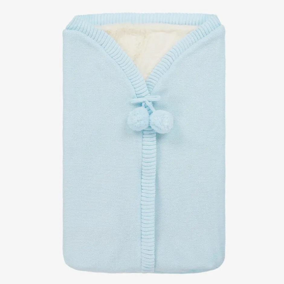 Super snuggly, knitted baby nest for boys and girls by Spanish brand Mebi, in a lovely light blue shade. It is lined in luxuriously soft ivory plush faux fur to keep your little one cosy and has a concealed front zip fastening. There are ribbed trims and decorative pom-poms on the front.