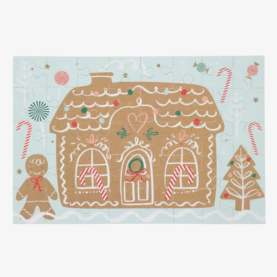 A fun, gingerbread house suitcase for boys and girls from Meri Meri, ideal for keeping them entertained on Christmas Eve. The beautifully illustrated suitcase is made in cardboard with a fun webbing handle and makes a super keepsake box long after the festive season is over. The box contains a cardboard puzzle, a colouring poster and two sheets of stickers, with further space for adding your own gifts and treats.