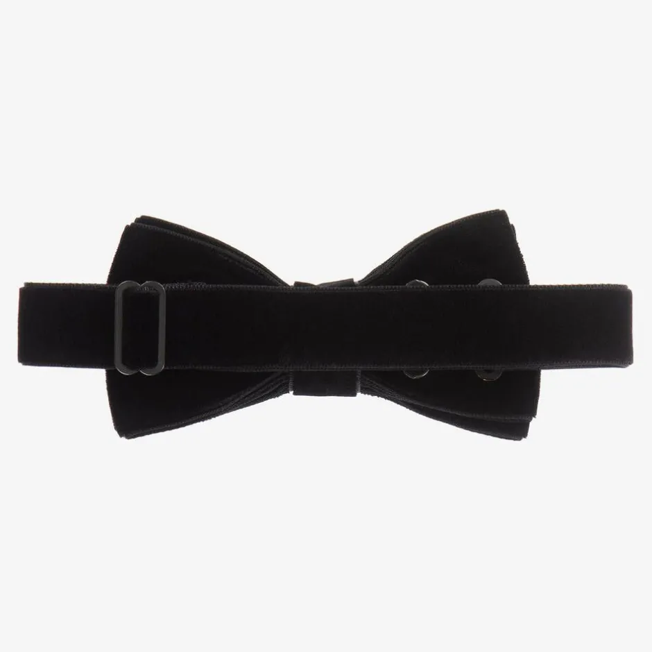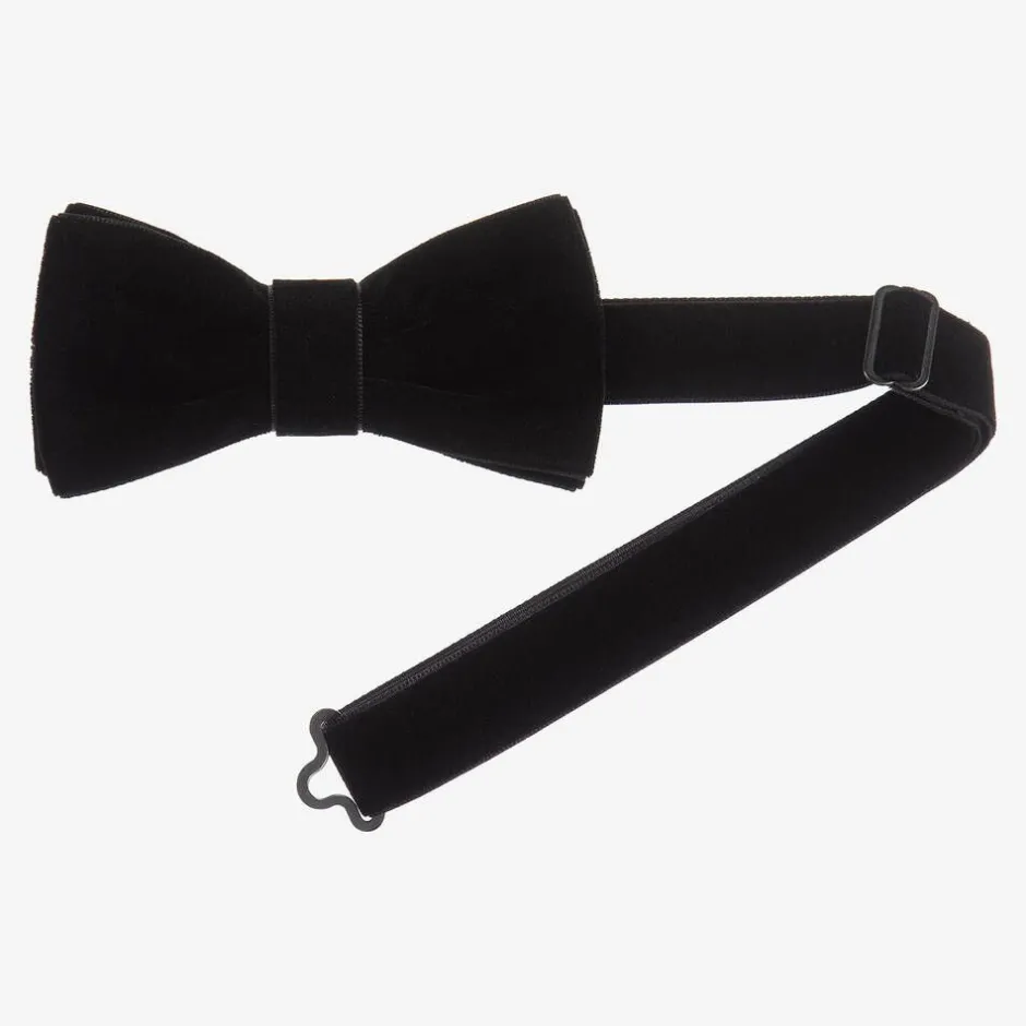 Smart black bow tie for boys by Milledeux. It is made in soft velvet ribbon and has an adjustable neck strap.