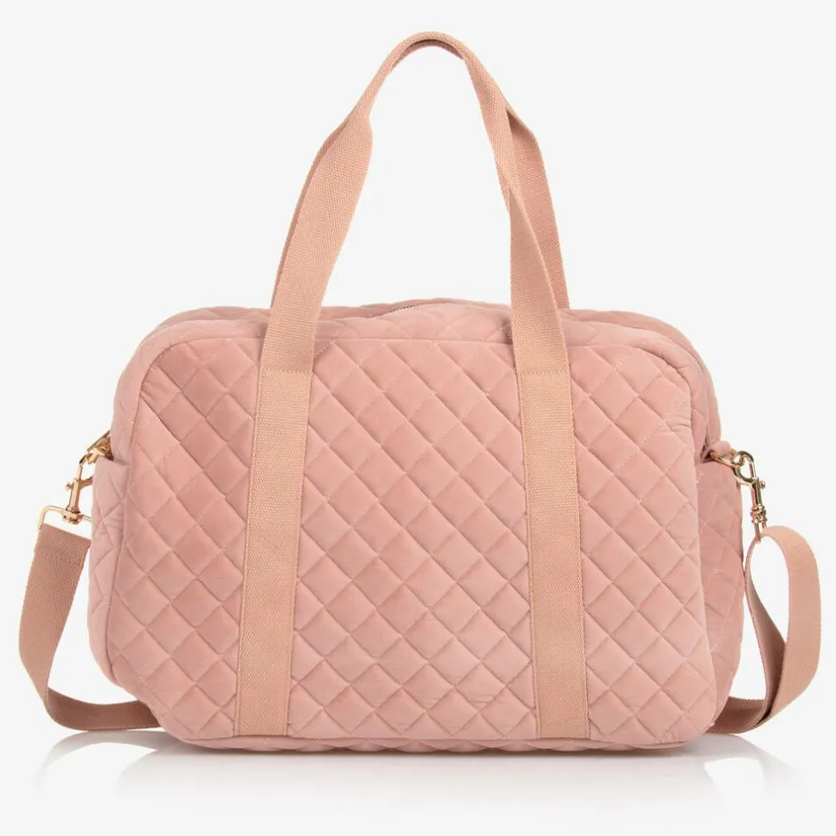 Pink changing bag by Milledeux, made in soft quilted velvet. The spacious main compartment has internal pockets and fastens with a zip. There are useful slip pockets on the front and sides and canvas webbing carry handles. This versatile bag has a detachable, adjustable shoulder strap and can also be used as a weekend bag or a sports bag.