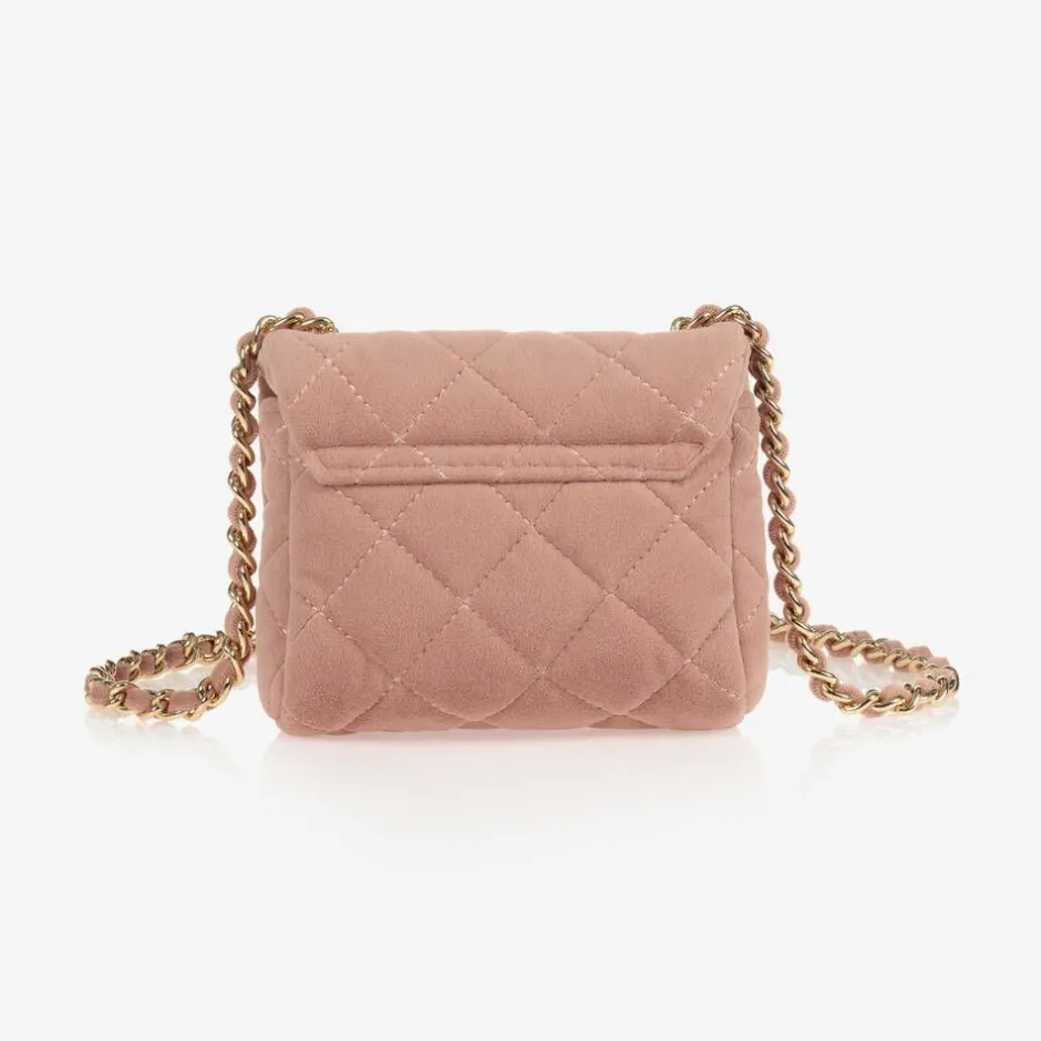 Girls small pink bag from Milledeux, beautifully handmade in soft quilted velvet. Lined in lightweight cotton, it is just right for carrying small essentials. The flap has a gold twist lock closure and the sumptuous velvet and gold chain strap can be doubled for a shorter length.